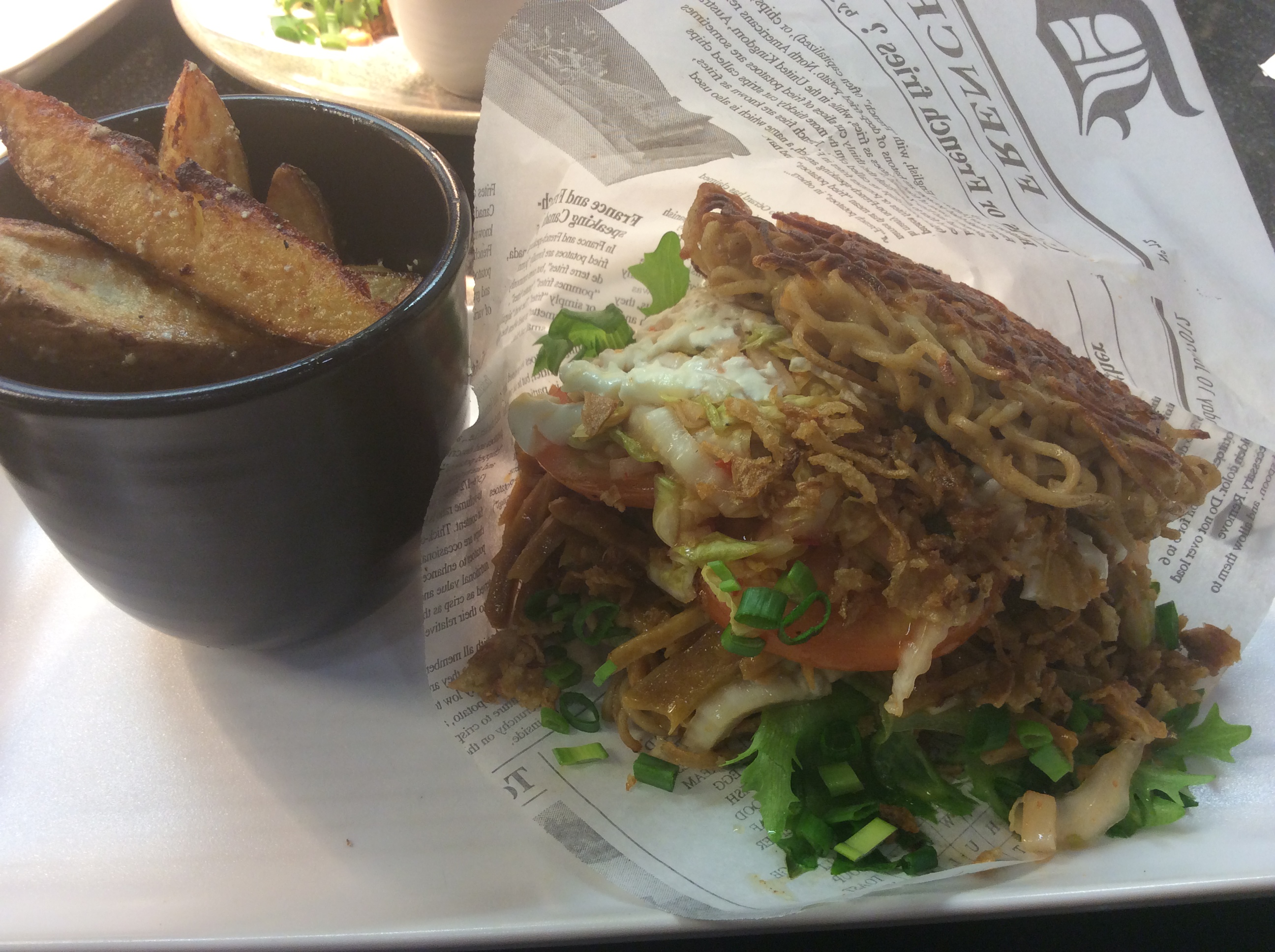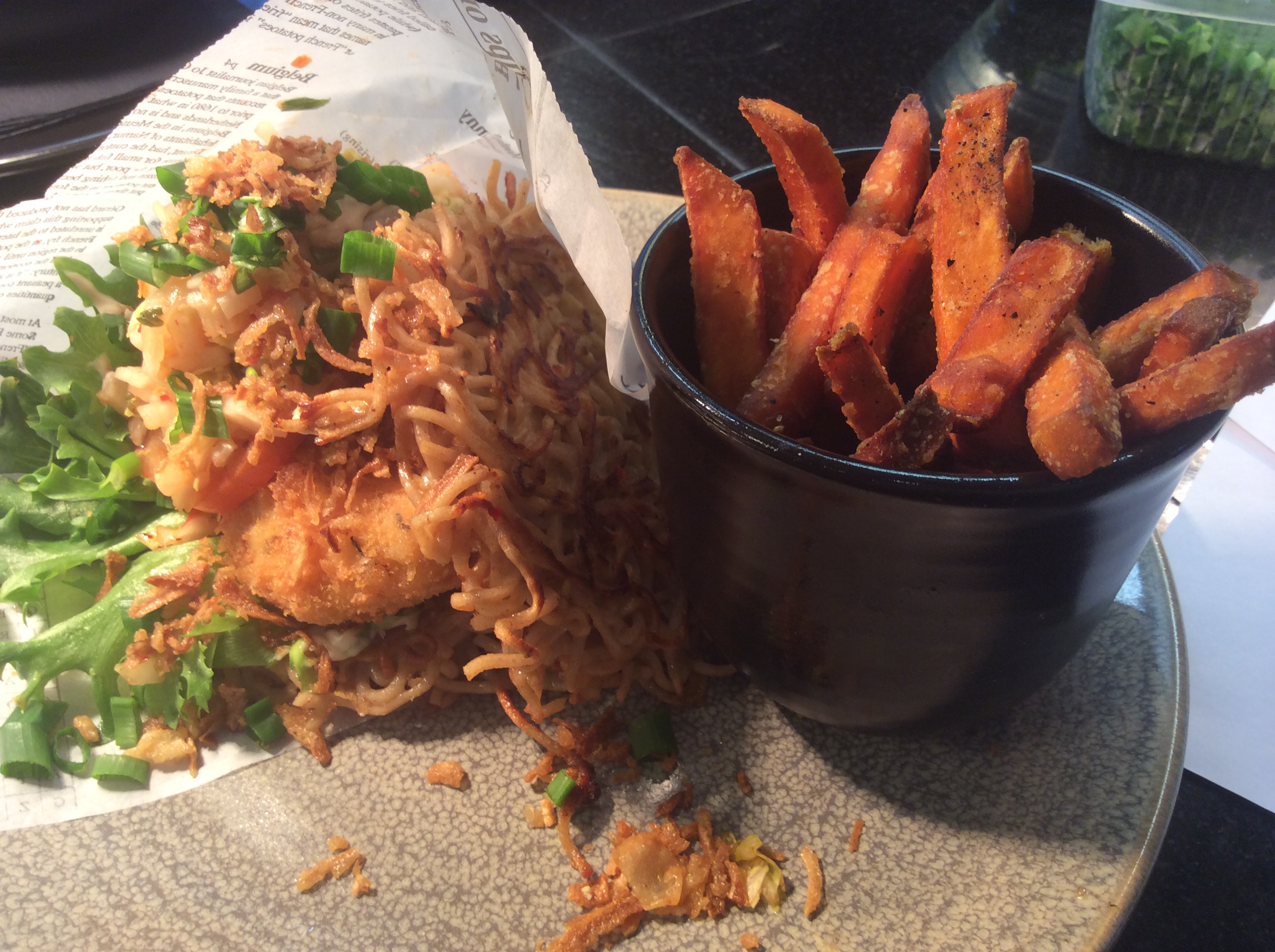 Gastro NOM Helsinki on ensimmäisiä ramen hampurilaista tarjoavia ravintoloita Suomessa. Reseptiä on kehitelty ja testattu pitkään ravintolapäällikön Tanja Sallisen kanssa. Gastro NOM Helsingin versiossa moniviljanuudelit keitetään, jäähdytetään, leikataan, prässätään ja pariloidaan sämpylän muotoon. Hampurilainen täytetään panko-jauhoissa leivitetyllä lohi-rapukakulla ja raikastetaan kimchillä eli korealaiseen tapaan valmistetulla kiinankaalisalaatilla.